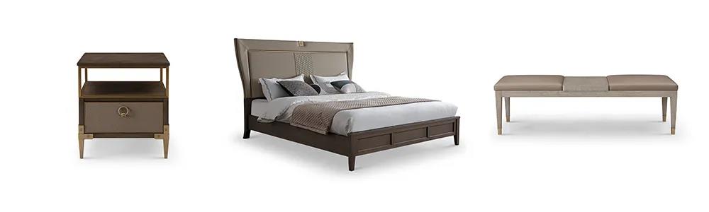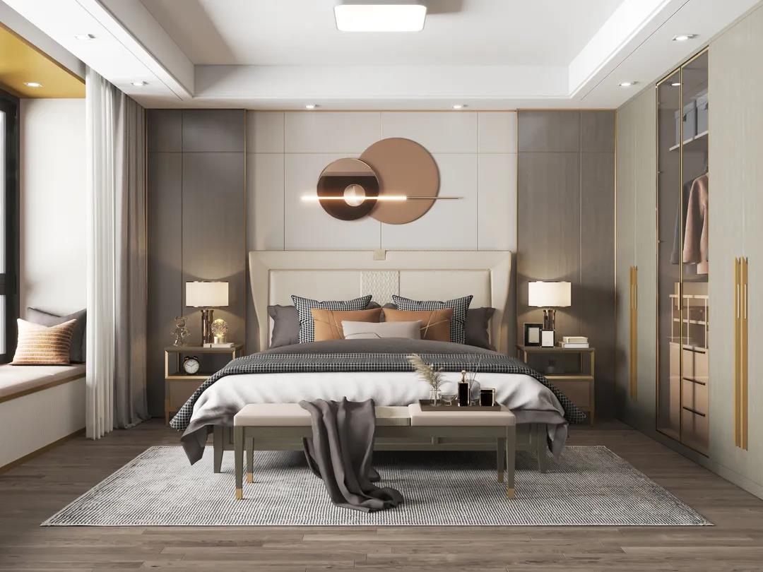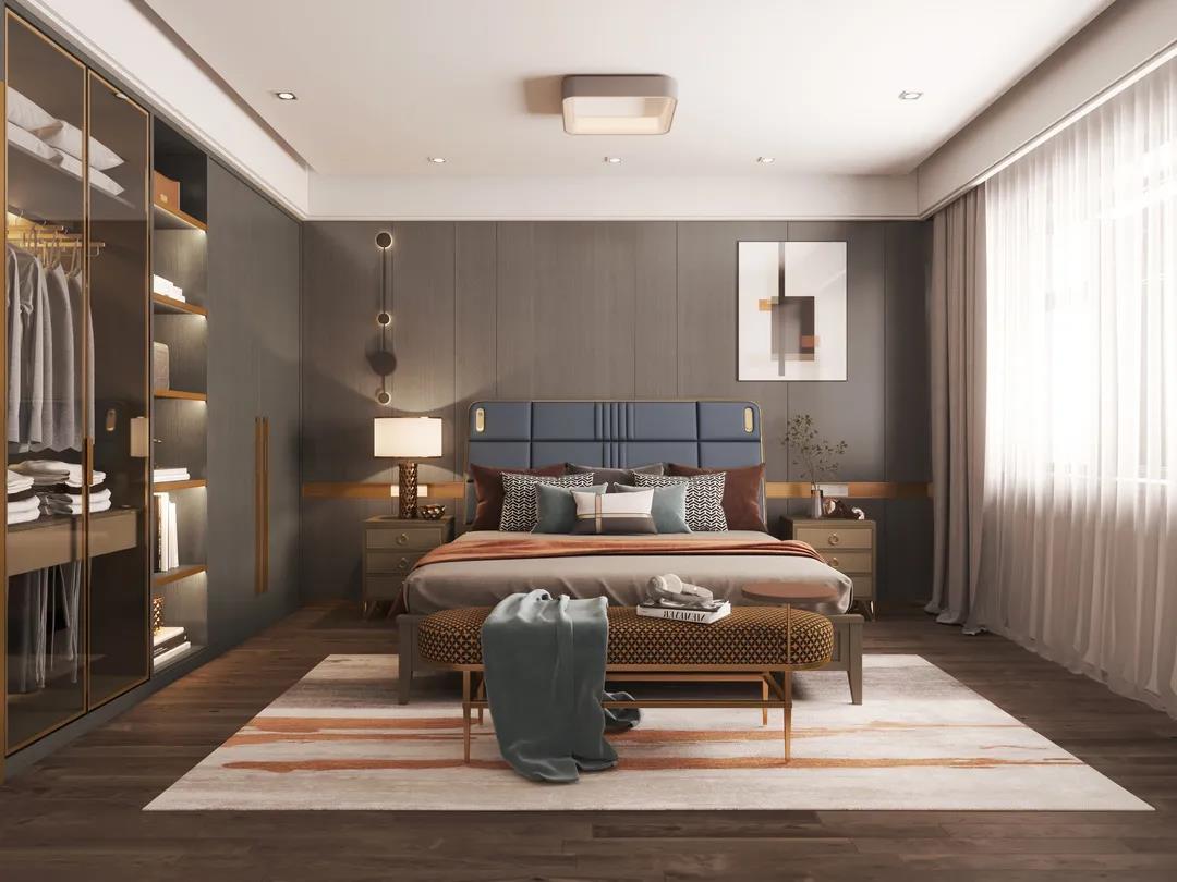 床屏时尚的雾霾蓝色,与素雅的床品营造出一种低调的简奢氛围。金属点缀着柜体拉手,床尾凳、床头柜等微小细节,让生活充满着内在涵养与力量。